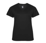 Badger Women's Untimate Softlock V-neck Jersey. Badger heat seal logo on left sleeve. Self-fabric collar. Badger sport paneled shoulder for maximum movement. Superior interlock fabric for comfort. Double-needle hem. 100% Soft polyester moisture management/antimicrobial performance fabric. UPF 50+ sun protection from UVA and UVB.